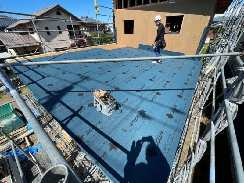 先日現場に行った際、2階の窓部分から下屋を覗いてルーフィングを見ていたら、アスファルトの香りが風に乗ってきました。いい匂いですよね、私好きなんです(笑)