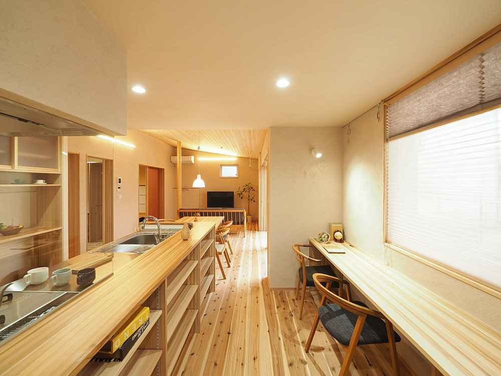 キッチンでは大型食洗器『ミーレ』を採用し、家事軽減が大きくなる。LDKからフラットに繋がるウッドデッキは空間の広がりをみせ、アウトリビングとして大きく活用できる。いつも居るリビングは上質な杉の節無し板で勾配天井を仕上げ、温もり感が増し、癒しの空間となった。