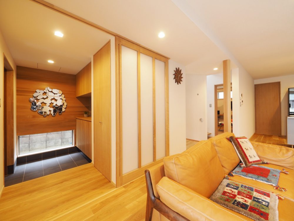 玄関ホールから建具一枚を介すとすぐにLDKへと繋がり、無駄な廊下を無くした。玄関から暖かい温熱環境を考える。幅広の片引き戸は存在感がある。