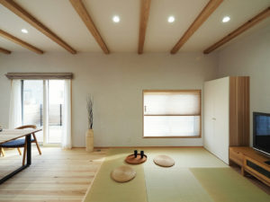 無垢の床・和紙の壁紙…洗練された素材にこだわり、パッシブで住む人の体(健康)と心(癒し)に良い影響を与えます。不易流行なシンプルデザインで、どの世代にも対応する本物の自然素材の家。